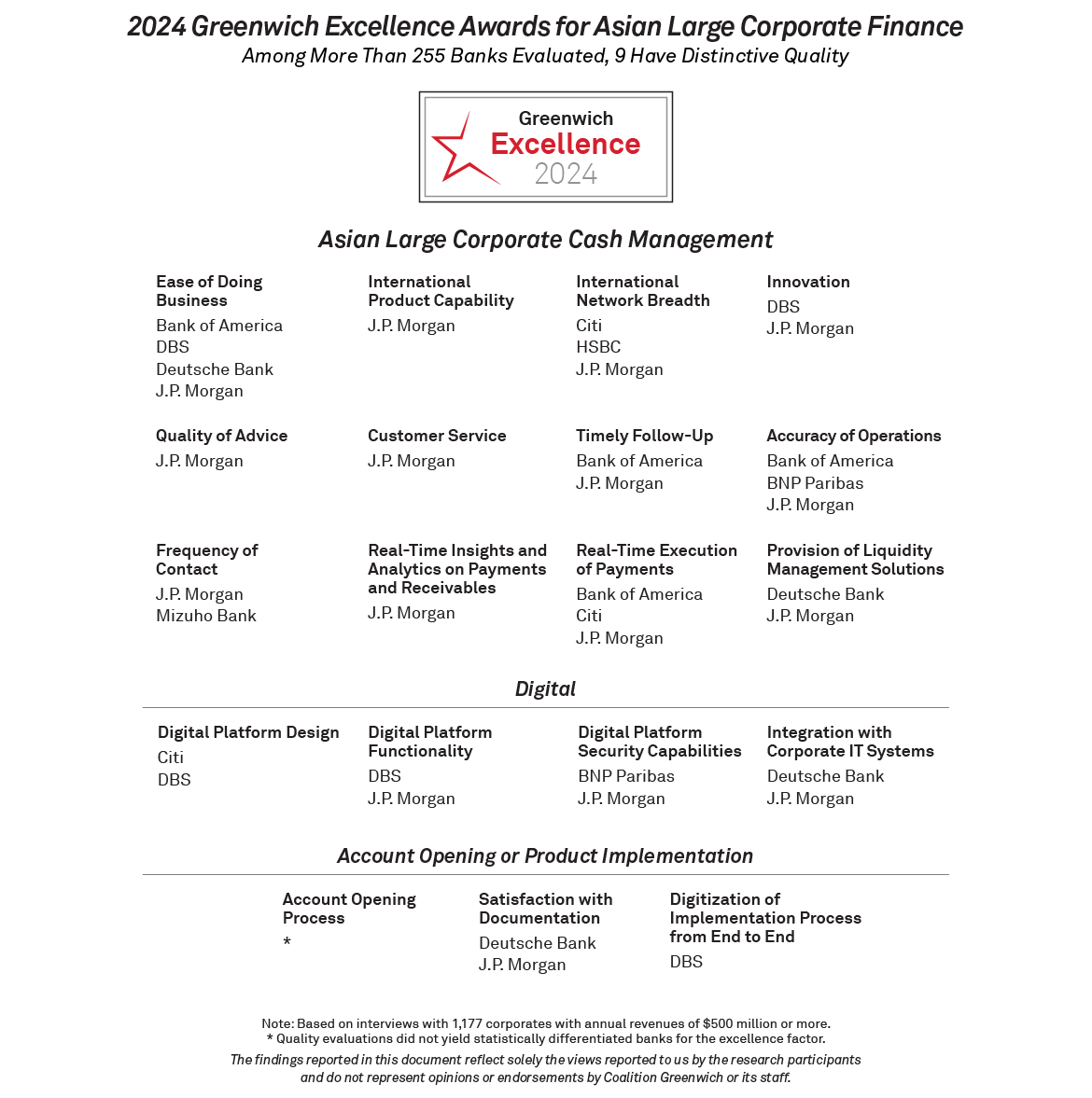 Coalition Greenwich presents the overall and regional lists of the 2024 Greenwich Share and Quality Leaders in Asian Large Corporate Banking, Asian Large Corporate Cash Management, Asian Corporate Foreign Exchange, and the winners of the 2024 Greenwich Excellence Awards in several important categories.