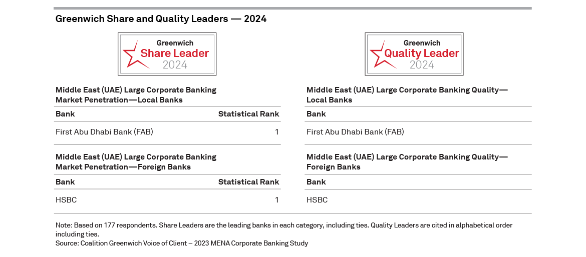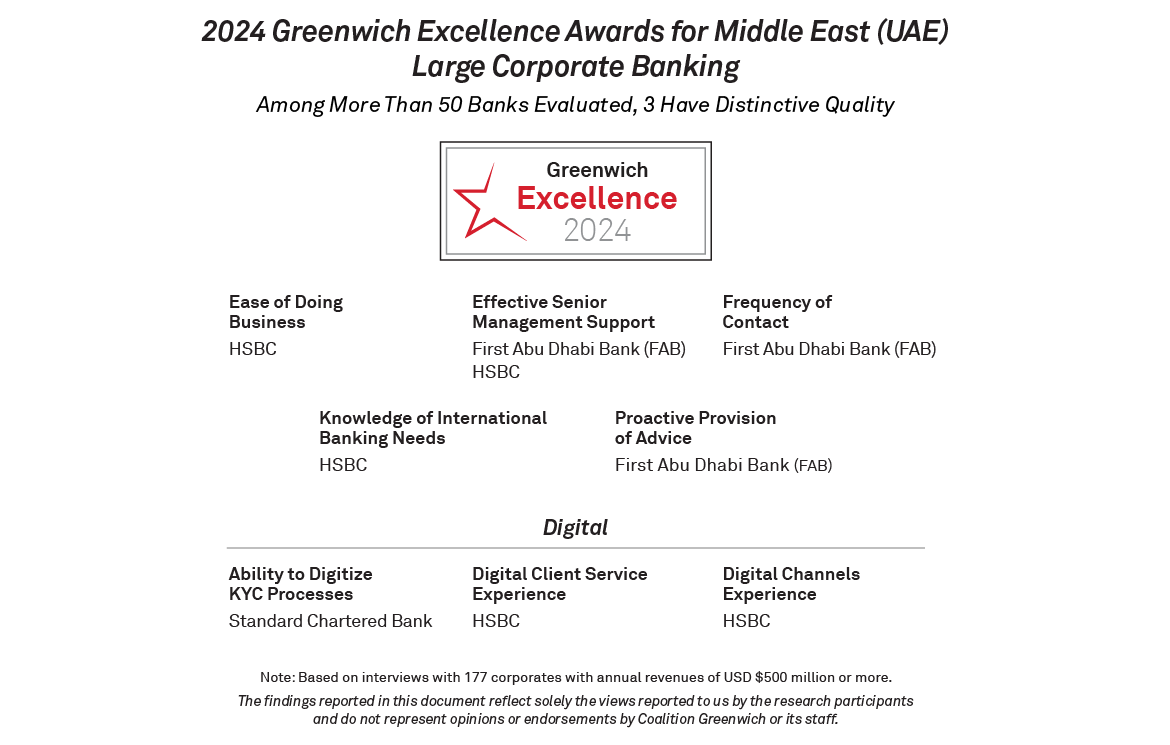For the first time, Coalition Greenwich presents the lists of the 2024 Greenwich Share and Quality Leaders in Middle East (UAE) Large Corporate Banking and the winners of the 2024 Greenwich Excellence Awards in several important categories.