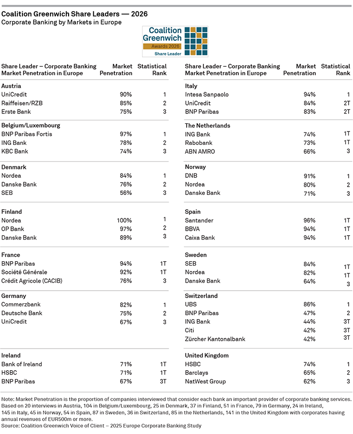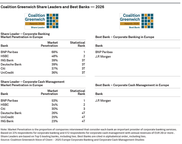 The following tables present the overall and regional lists of the 2026 Coalition Greenwich Share Leaders and Best Banks in Corporate Banking, Cash Management and Foreign Exchange in Europe.