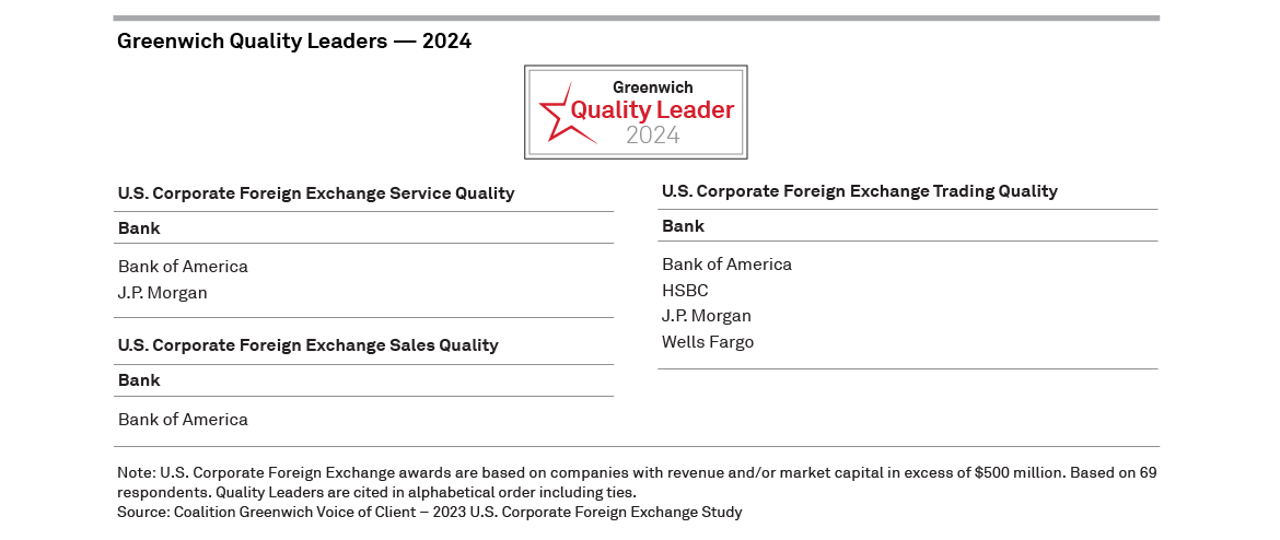 Coalition Greenwich presents the lists of the 2024 Greenwich Quality Leaders in U.S. Corporate Foreign Exchange.